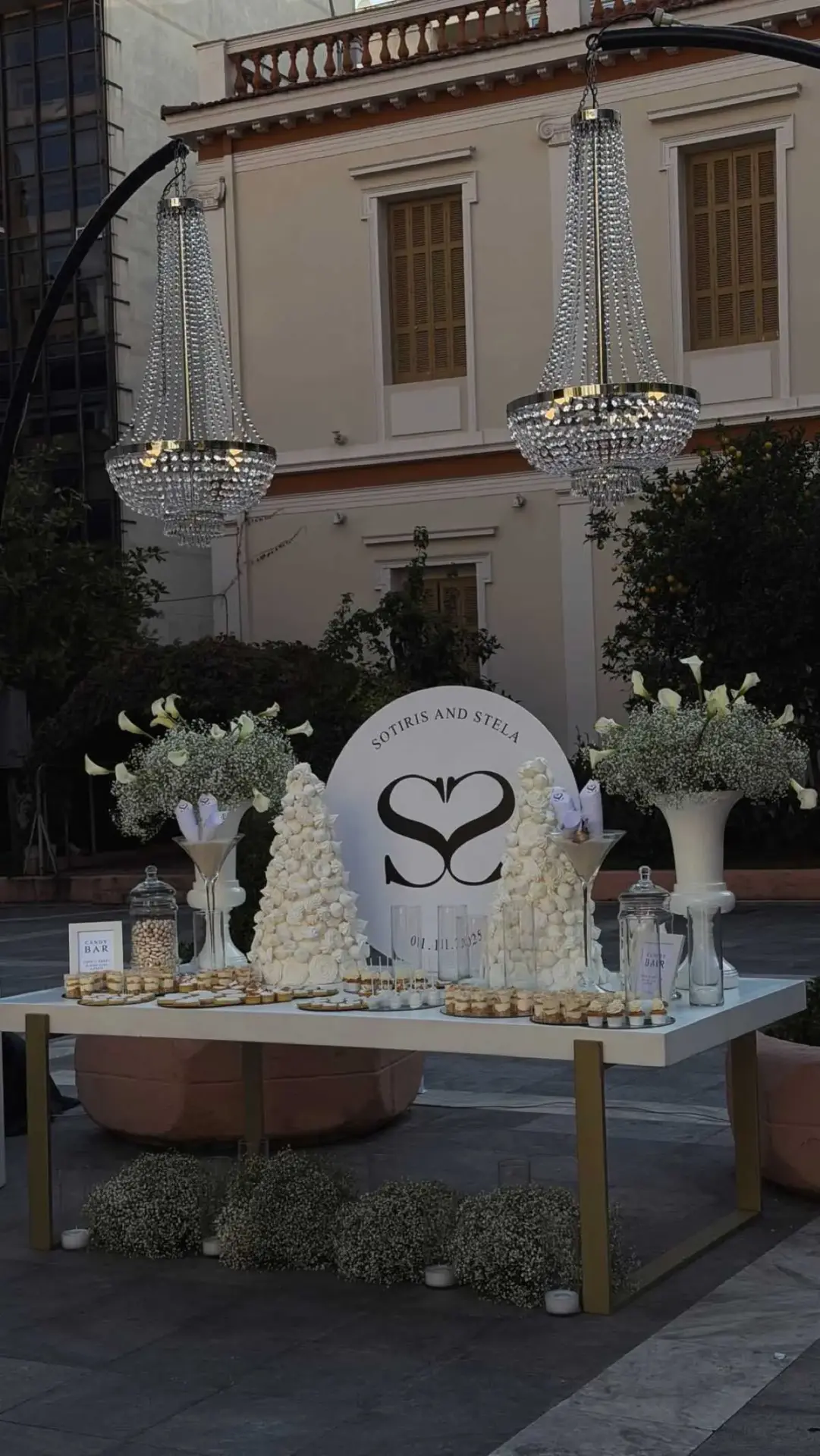 Ο στολισμός εκπέμπει λάμψη και πολυτέλεια με τους μεγάλους πολυέλαιους και τον περιποιημένο μπουφέ, δημιουργώντας ένα άκρως κομψό και διακριτικό σκηνικό.